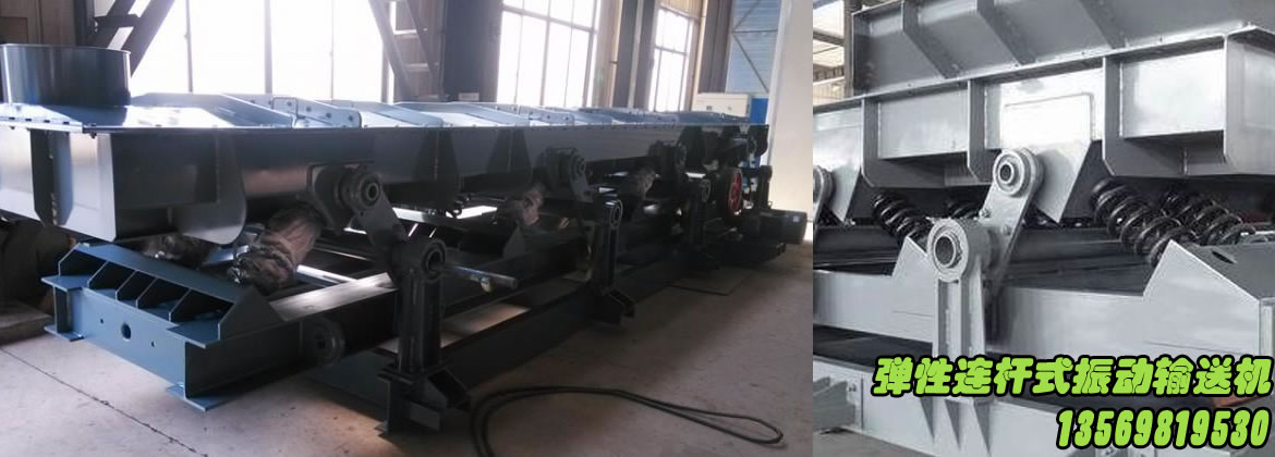 彈性連桿輸送機的驅動連桿機構由電動機,皮帶輪、傳動軸、偏心連桿裝置組成。輸送槽與底架之間用螺旋彈簧聯接,該彈簧是主振彈簧,導向桿起輸送槽振動導向作用,輸送機運行中驅動機構使連桿端部作往復運動,而連桿通過其端部的螺旋彈簧帶動輸送槽作往復運動,使物料沿振動方向被連續拋起向前跳躍,達到輸送物料的目的。